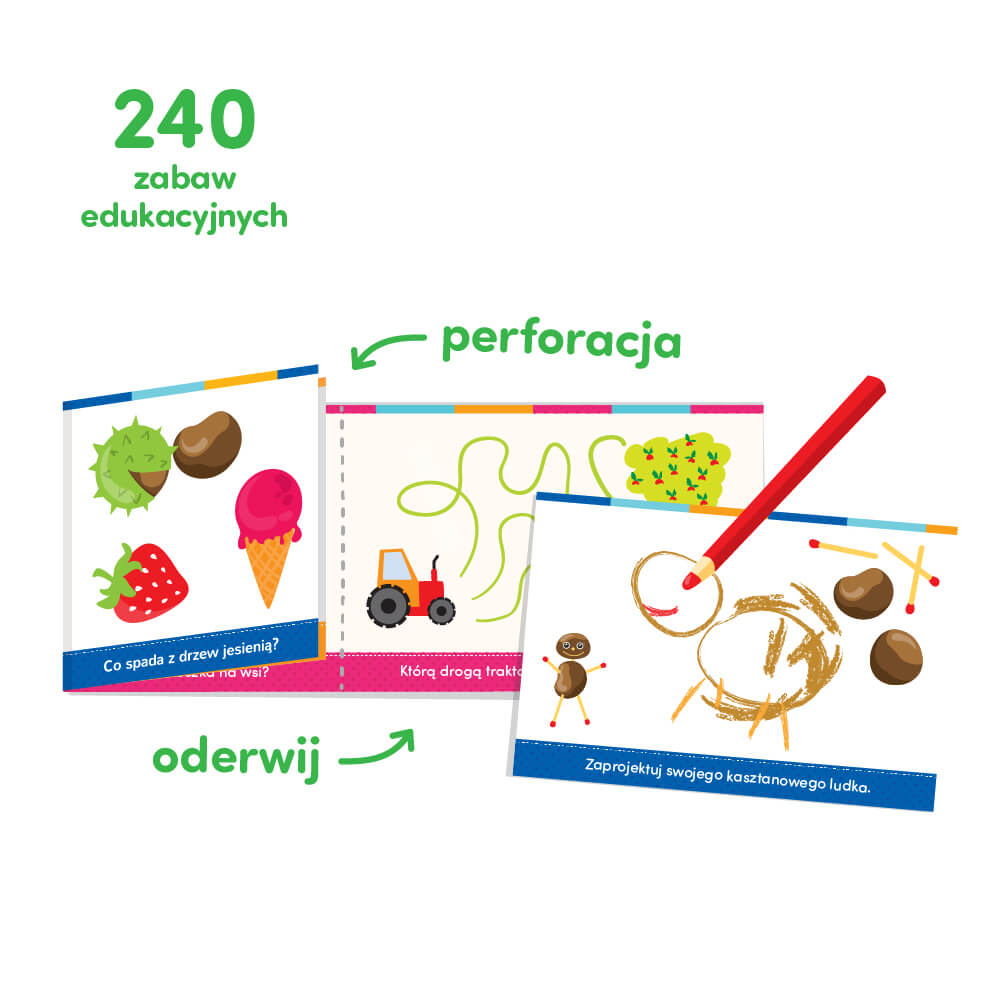 Fantastyczne zabawy dla rączki i główki! Poręczna edukacyjna książeczka zawiera 240 rozwijających zadań dla dzieci od 3 lat. Każda strona składa się z części z informacją, zagadką lub zadaniem oraz części do gryzmolenia i zakreślania. Dzięki perforacji można oderwać fragment do rysowania i cieszyć się obrazkową książeczką z ciekawostkami.