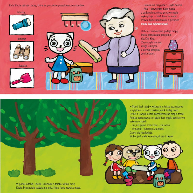 Przygotuj się na niezwykłą przygodę z Kicią Kocią oraz jej przyjaciółmi! Ta książka to doskonała propozycja dla najmłodszych, którzy uwielbiają odkrywać tajemnice i poszukiwać skarbów. Wraz z Packiem, Adelką i Juliankiem, mali czytelnicy wyruszą w ekscytującą podróż, która z pewnością dostarczy niezapomnianych emocji.