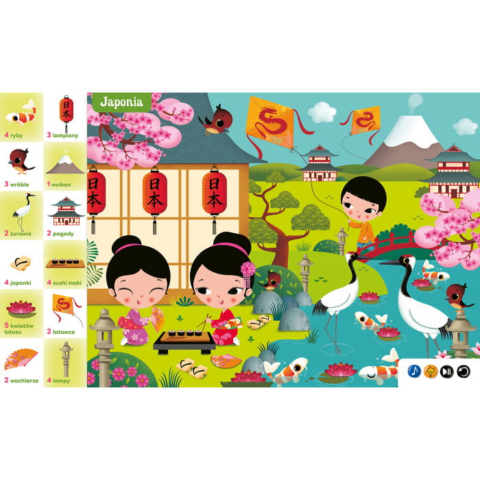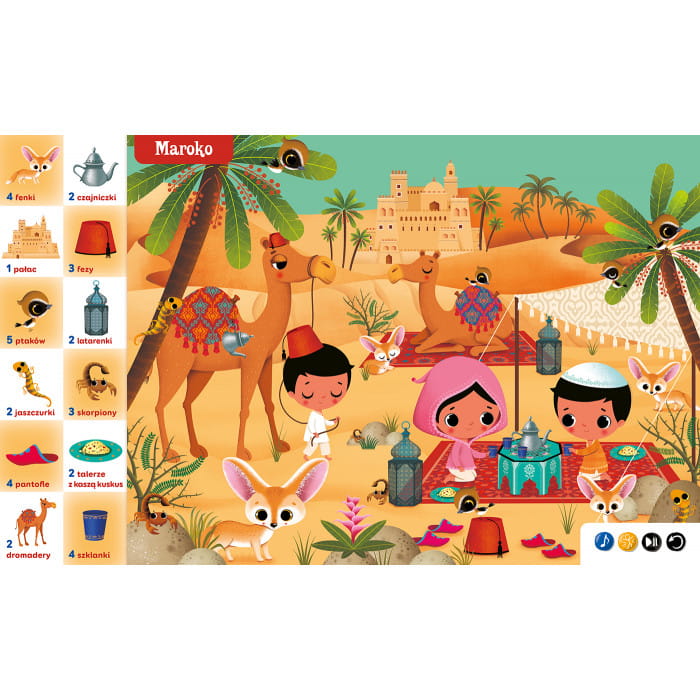 Maluchy bawią się i rozwijają spostrzegawczość, poznając około 200 słów. Nabierają wprawy w liczeniu do pięciu, a także zapoznają się z charakterystycznymi cechami poszczególnych krajów, świetnie uchwyconymi na uroczych i pełnych szczegółów ilustracjach.