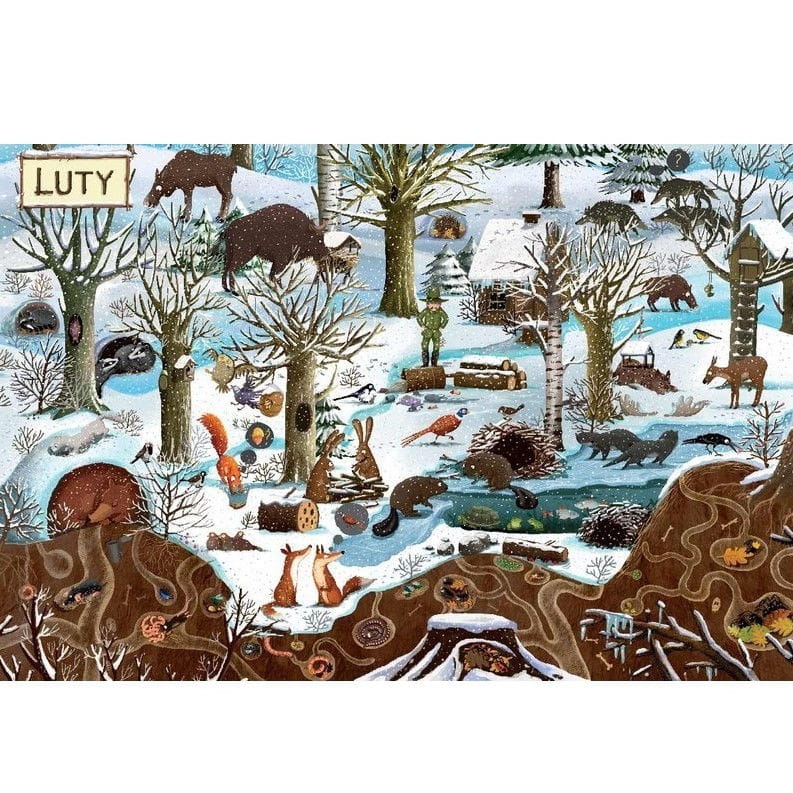 Poszukajcie odpowiedzi na kartach tej niezwykłej książki. "Rok w lesie" zawiera dwanaście rozkładówek z kolejnymi miesiącami jednego roku. Każdy miesiąc to ten sam szczegółowo rozrysowany kadr lasu z mieszkańcami pokazanymi w innych sytuacjach, warunkach pogodowych, w innej porze dnia lub nocy. Dwie dodatkowe rozkładówki zawierają prezentację bohaterów i interaktywną zabawę.