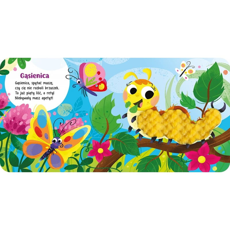 Bohaterami tej książeczki są mieszkańcy łąki: puchaty zajączek, włochata gąsienica, żaba z karbowaną skórą, welurowy kret, motyl z cekinowymi skrzydłami i ślimak ze skorupą ze skaju.