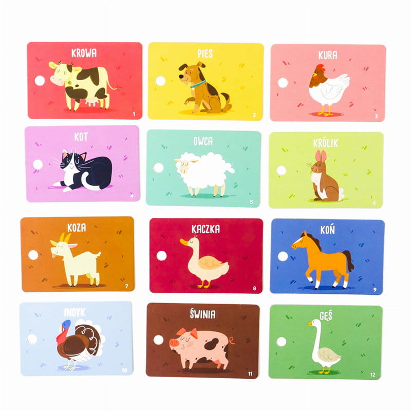 Wzrok Twojego niemowlęcia rozwinął się na tyle, że czas pokazać mu wszystkie kolory tęczy! Prezentuj mu karty ze zwierzętami, a imitując ich odgłosy, wspomóż również rozwój słuchu i… mowy maluszka – dziecko na pewno uśmiechnie się szeroko, słysząc gdaczącego tatę czy muczącą mamę. Pamiętaj, że na tym etapie dziecko może brać już karty do rączek. Nie obawiaj się, jeśli weźmie kartę do buzi – wykonane są one z bezpiecznych materiałów.