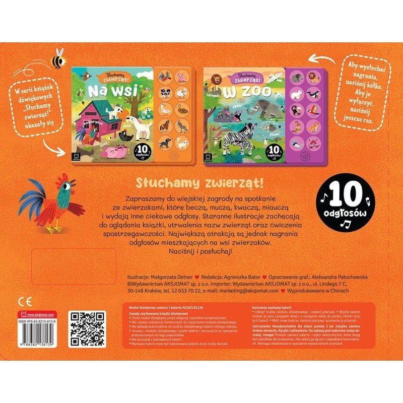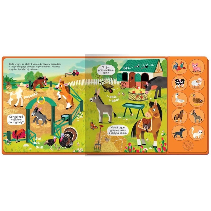 Obrazki w książce zachęcają również do opowiadania, opisywania, wskazywania szczegółów i ich liczenia. Do książki dołączony jest panel dźwiękowy z głośniczkiem i przyciskami. Dzieci z łatwością uruchamiają same realistyczne nagrania, tym samym uczą się samodzielności i rozwijają motorykę małą. Gdy nagrania już się znudzą, można zablokować ich odtwarzanie.