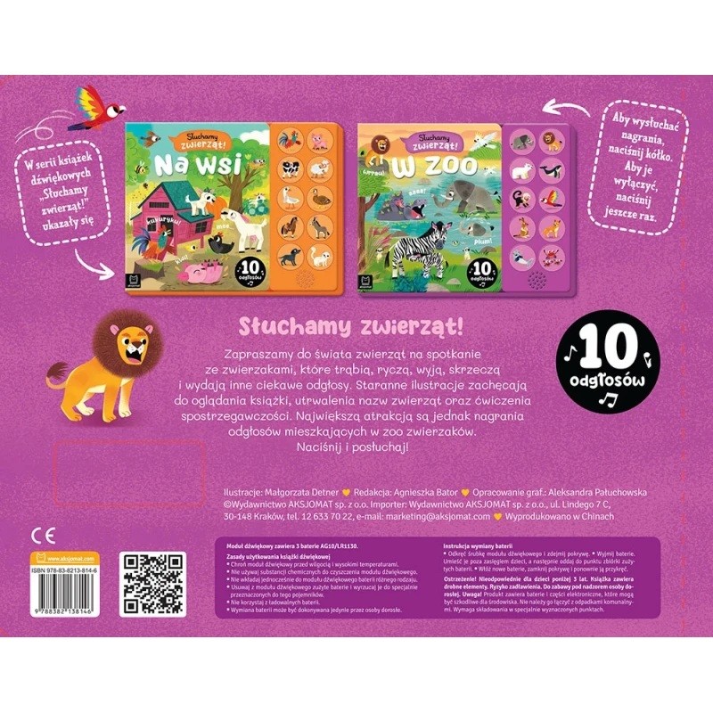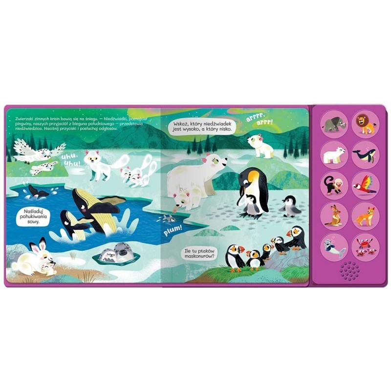 Obrazki w książce zachęcają również do opowiadania, opisywania, wskazywania szczegółów i ich liczenia. Do książki dołączony jest panel dźwiękowy z głośniczkiem i przyciskami. Dzieci z łatwością uruchamiają same realistyczne nagrania, tym samym uczą się samodzielności i rozwijają motorykę małą. Gdy nagrania już się znudzą, można zablokować ich odtwarzanie.