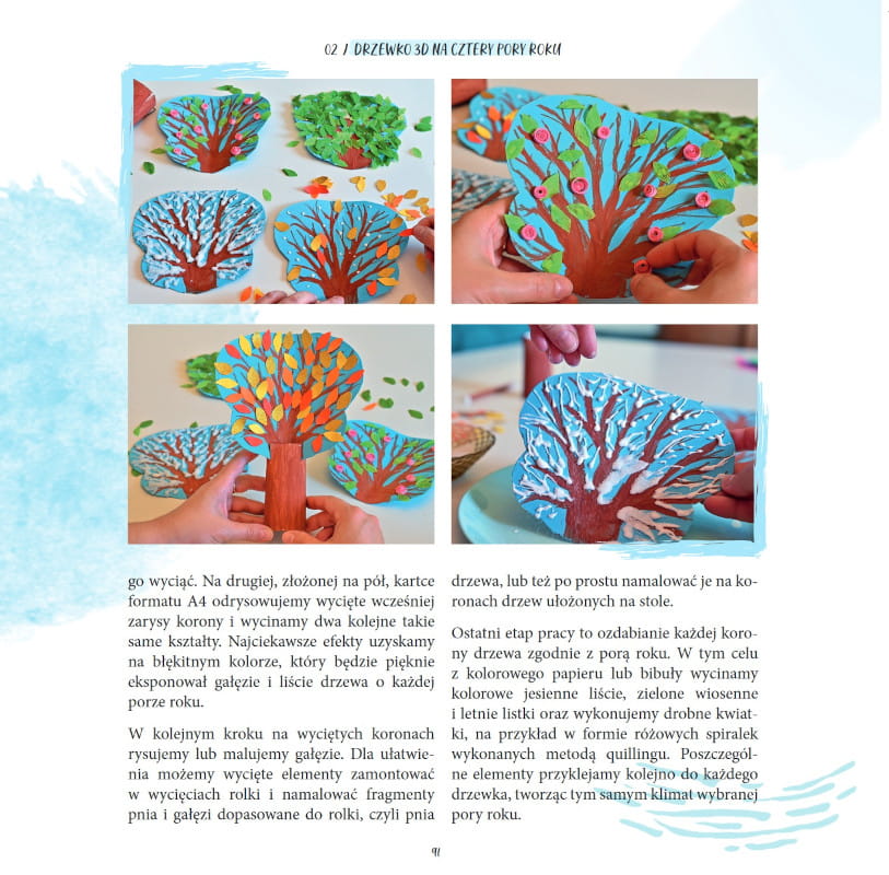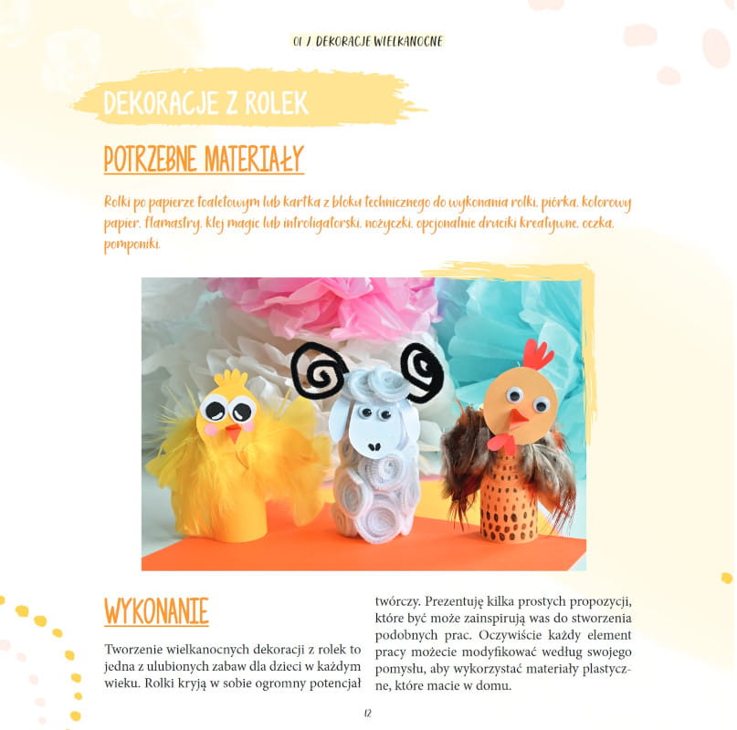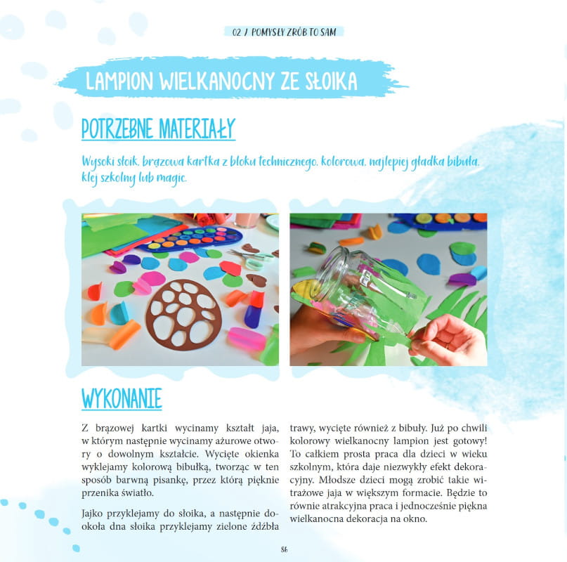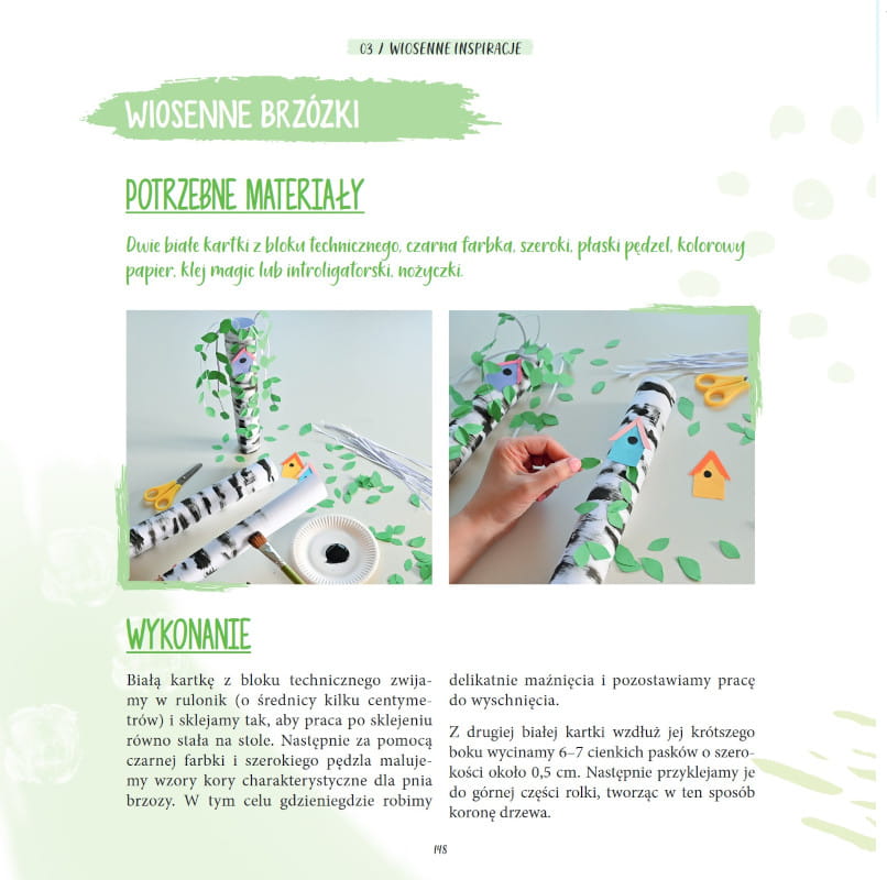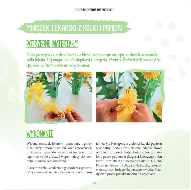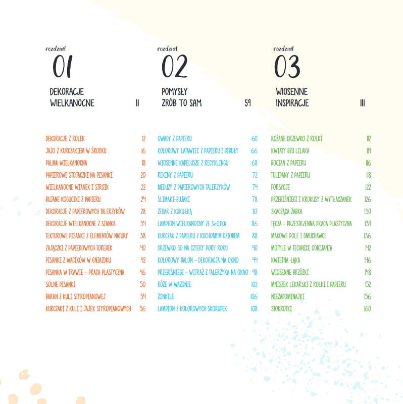Zawiera inspiracje i pomysły dostosowane do wiosennej pory roku oraz różnorodne pomysły na twórcze aktywności, czy warsztaty kreatywne. Razem z książką wykonacie ciekawe prace plastyczne z elementów natury, z papieru, bibuły, czy rolek. W książce oprócz wiosennych pomysłów i dekoracji jest też twórczość związana z Wielkanocą i pomysły zrób to sam.