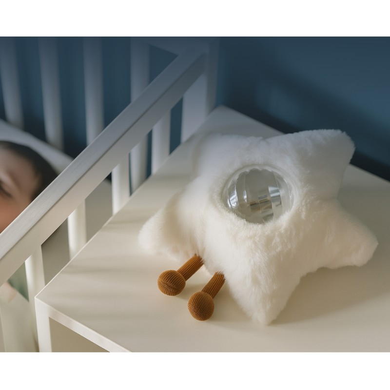 Cry sensor automatycznie włącza światło i dźwięk, gdy wykryje płacz dziecka, pomagając mu szybciej się uspokoić.