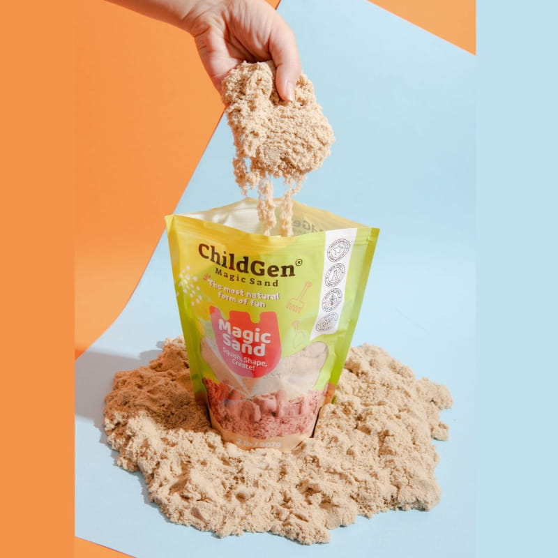W przeciwieństwie do tradycyjnych piasków kinetycznych, które często bazują na oleju i silikonie, ChildGen stawia na 100% naturalności. Piasek powstaje z naturalnego piasku morskiego, który w połączeniu z wodą i naturalnym polimerem nabiera swoich "kinetycznych" właściwości, takich jak miękkość i efekt ruchu/"puchnięcia". Unikalnym dodatkiem są także spożywcze aromaty.