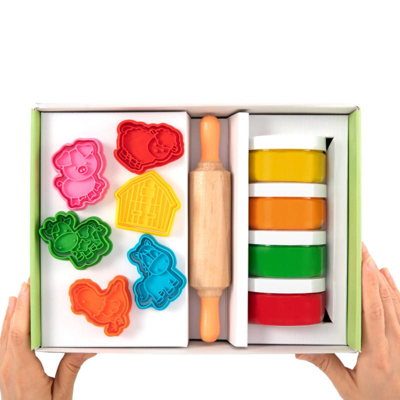 W zestawie znajduje się 12 foremek do wykrawania kształtów i stemplowania, w tym formy przedstawiające krowę, konia, kurę, owcę, świnkę oraz kurnik. Maluch może rozwałkować ciastolinę za pomocą drewnianego wałka, wykroić ulubione zwierzątko, a następnie odcisnąć je stempelkiem. To wspaniała okazja do zabawy w naśladowanie dźwięków zwierząt, nauki ich nazw oraz rozpoznawania kolorów.