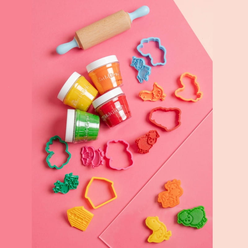 Opakowanie zawiera 4 słoiczki ciastoliny po 125g każdy, wałek, 12 form do wykrawania kształtów i stemplowania.