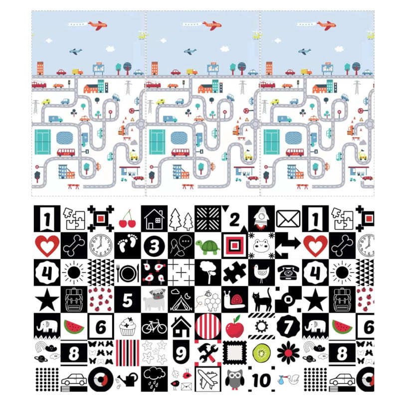 Mata jest dwustronna - możesz swobodnie zamieniać ją stronami. Strona z czarno białymi kontrastowymi wzorami jest specjalnie zaprojektowana dla najmłodszych - noworodków i niemowląt. Takie właśnie kolory są dla nich najbardziej interesujące. Są tam także cyferki, które pomogą w nauce starszym dzieciom.