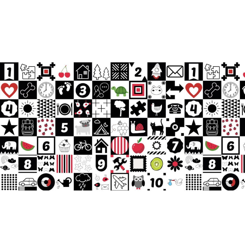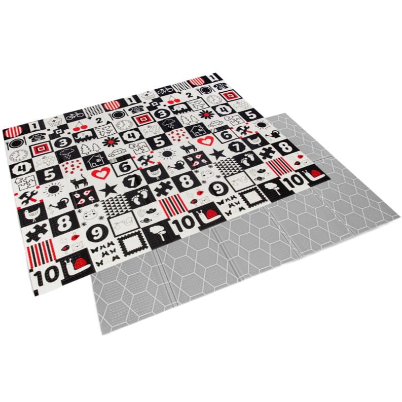 Mata jest dwustronna - możesz swobodnie zamieniać ją stronami. Strona z czarno białymi kontrastowymi wzorami jest specjalnie zaprojektowana dla najmłodszych - noworodków i niemowląt. Takie właśnie kolory są dla nich najbardziej interesujące. Są tam także cyferki, które pomogą w nauce starszym dzieciom.