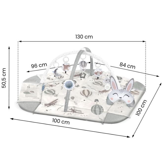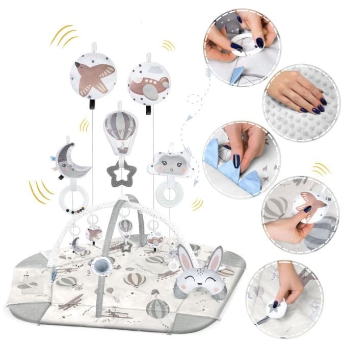 Mata ma pastelowe kolory. W zestawie znajduje się 5 zabawek do zawieszenia oraz lusterko i wałek - poduszka króliczek tummy time, na której można wesprzeć maluszka leżącego na brzuszku.