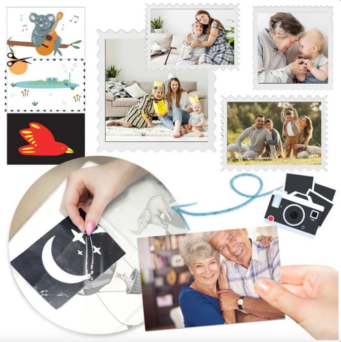 W macie znajdują się wszyte 2 przezroczyste kieszonki, w które można wsunąć dowolne zdjęcia lub karty kontrastowe. Na opakowaniu znajdują się również 4 obrazki, które można wyciąć i wykorzystać!