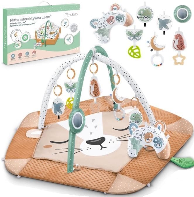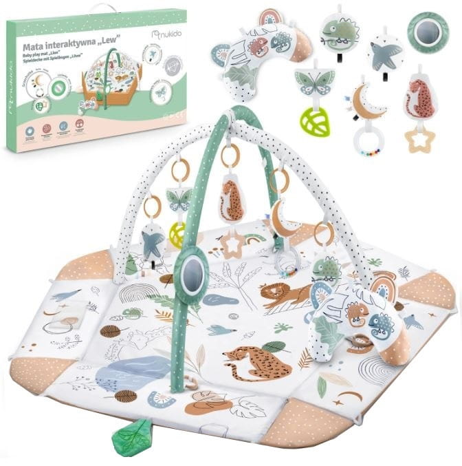 Mata ma pastelowe kolory. W zestawie znajduje się 5 zabawek do zawieszenia oraz lusterko i wałek - poduszka tummy time, na której można wesprzeć maluszka leżącego na brzuszku.