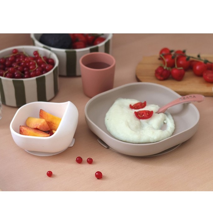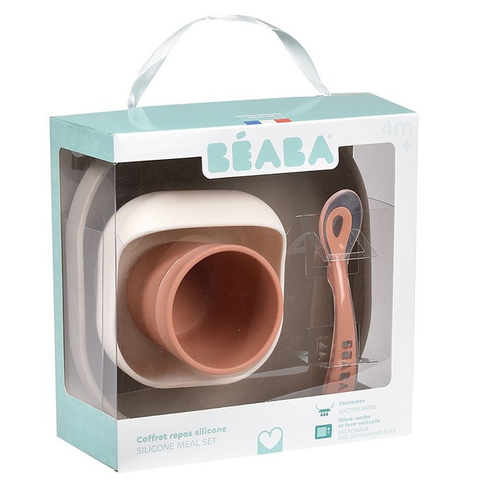 Komplet naczyń z silikonu francuskiej marki BEABA składa się z talerzyka, miseczki, kubka i łyżeczki treningowej.