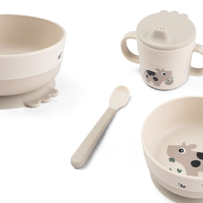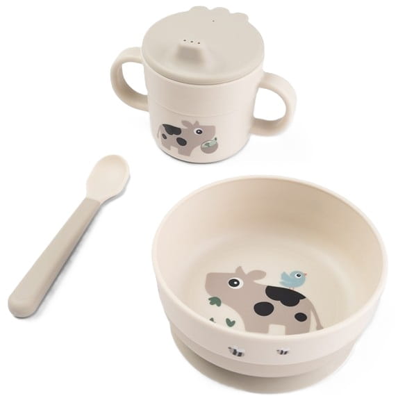 Pierwszy Zestaw Obiadowy Foodie Tiny Farm Sand z motywem krówki.