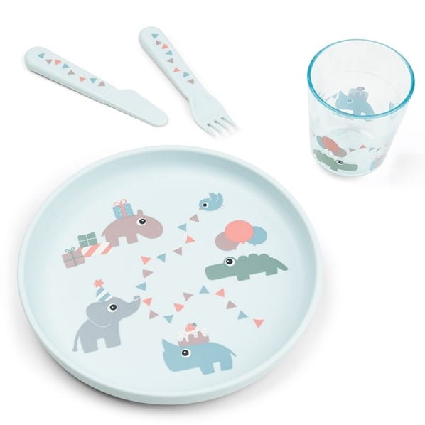 - kompletny zestaw na pyszny obiadek: talerzyk, sztućce, kubek i książeczka dla umilenia oczekiwania na posiłek,