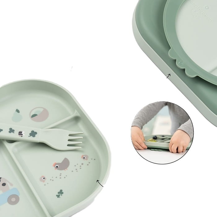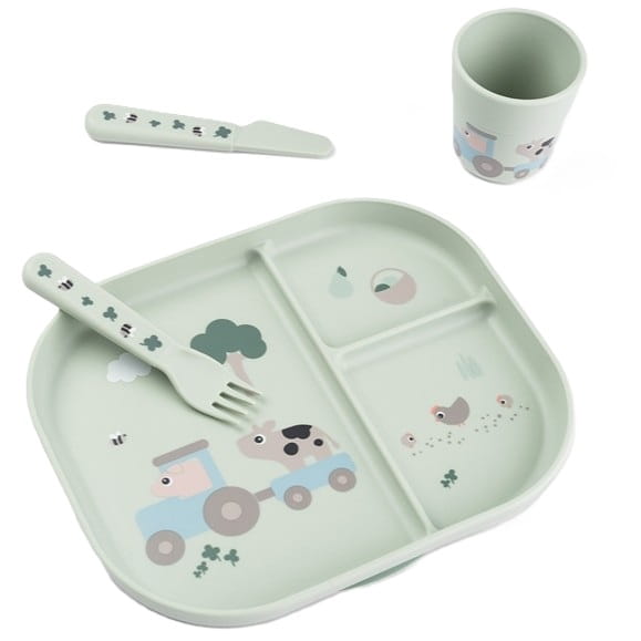 Ten zestaw obiadowy z kolekcji Tiny Farm to talerzyk z praktyczną przyssawką, kubek oraz zestaw sztucćców idealnie dopasowanych do małych rączek.