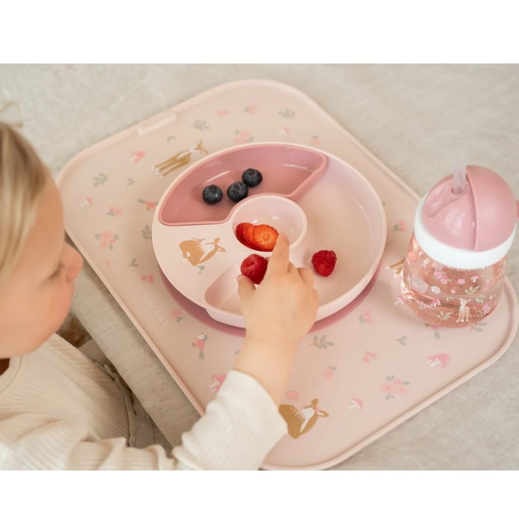 - Antypoślizgowy pierścień – dzięki temu rozwiązaniu talerzyk lub miseczka pozostają stabilnie na miejscu, minimalizując bałagan i frustrację podczas jedzenia.