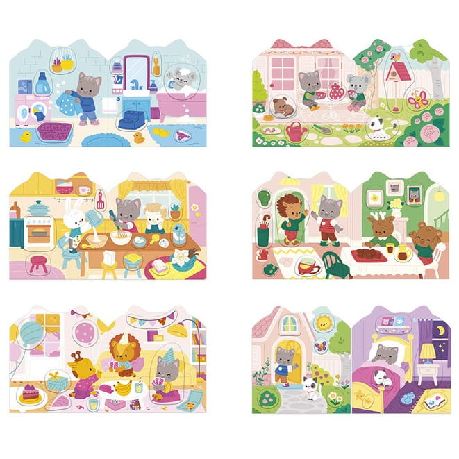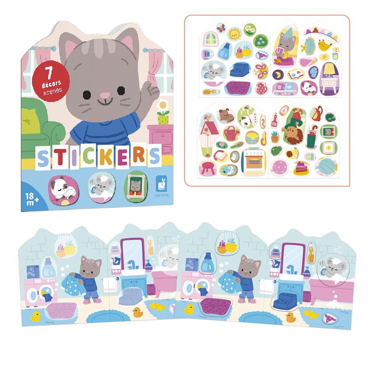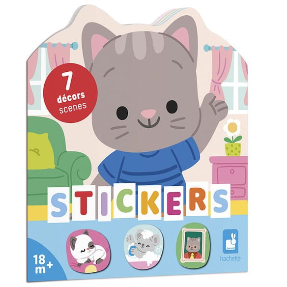 Książeczka zawiera wewnątrz 7 różnych scen z pustymi miejscami do wypełnienia naklejkami. Dziecko może śledzić losy bohatera – szarego kotka – podczas jego codziennych aktywności, opowiadać o nich i jednocześnie samodzielnie uzupełniać ilustracje załączonymi do książki naklejkami (ponad 50 szt.).