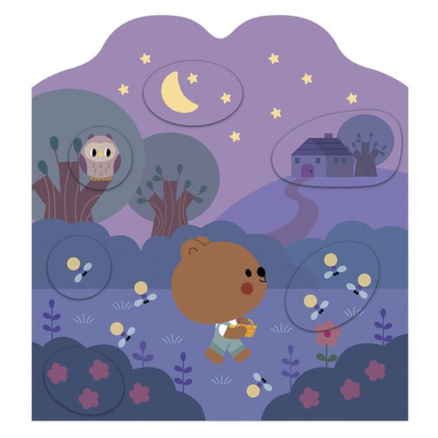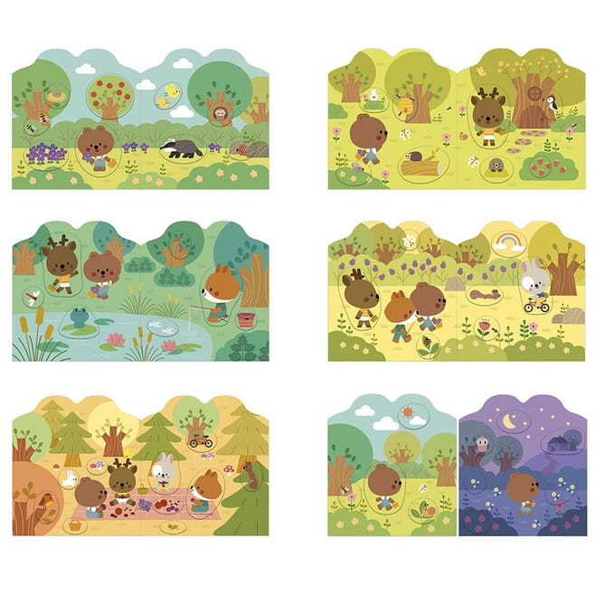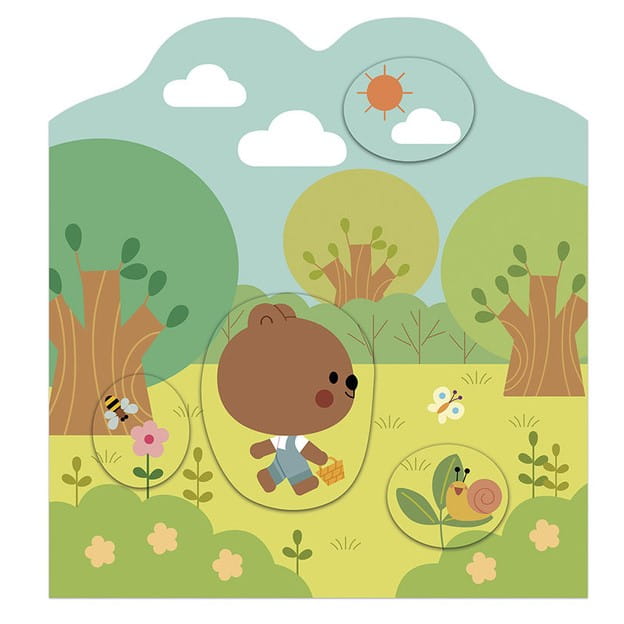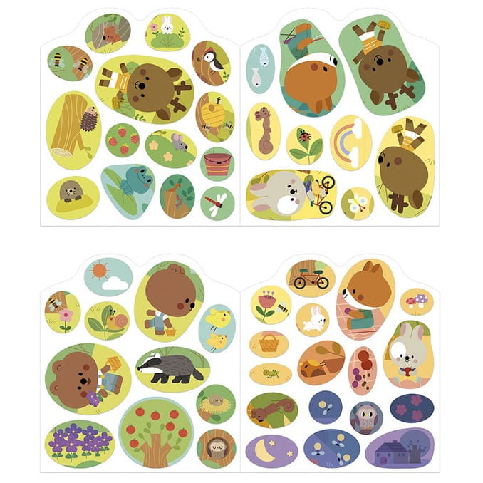 Książeczka zawiera wewnątrz 7 różnych scen z pustymi miejscami do wypełnienia naklejkami. Dziecko może śledzić losy bohaterów opowieści – leśnych zwierzątek - opowiadać o nich i jednocześnie samodzielnie uzupełniać ilustracje załączonymi do książki naklejkami (ponad 50 szt.).