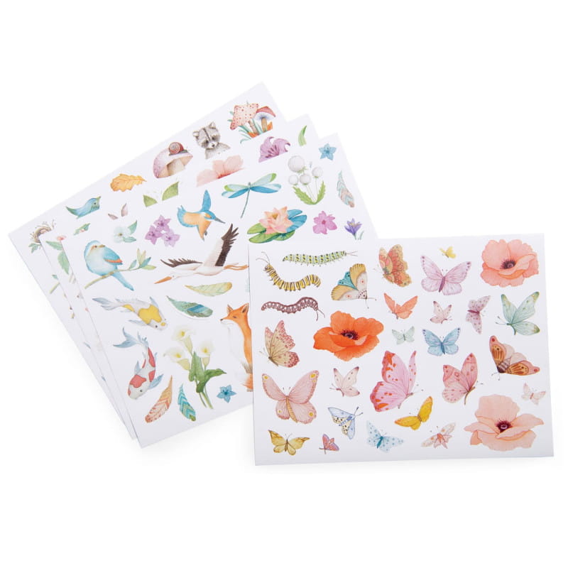 Zestaw 4 arkuszy (108 naklejek) z pięknie ilustrowanymi motywami kwiatów, motyli, ptaków i innych zwierzątek.