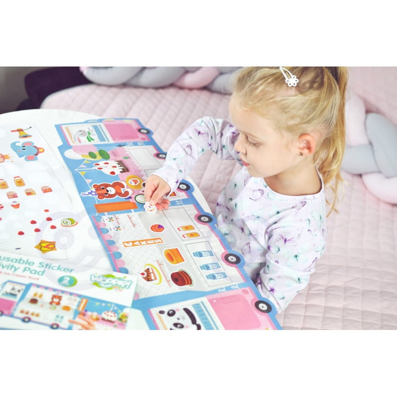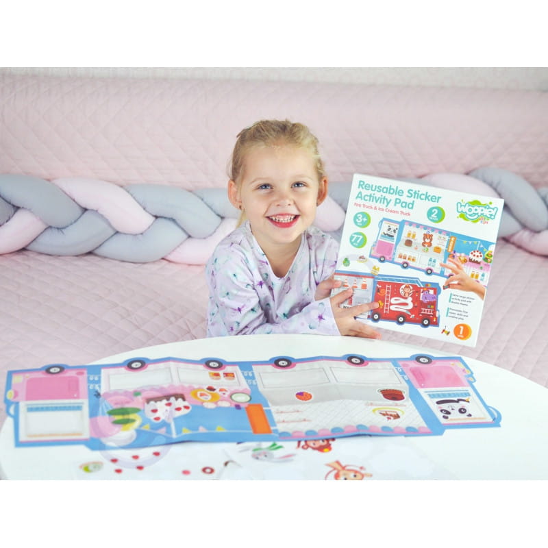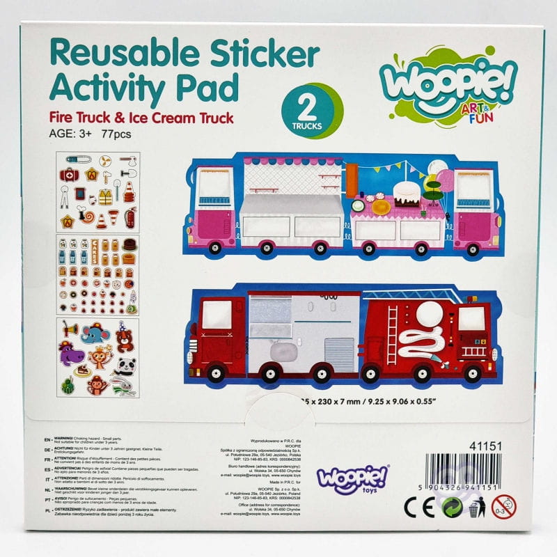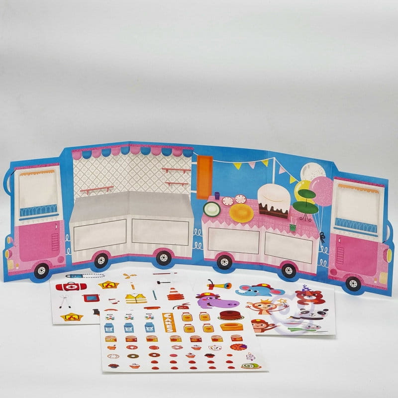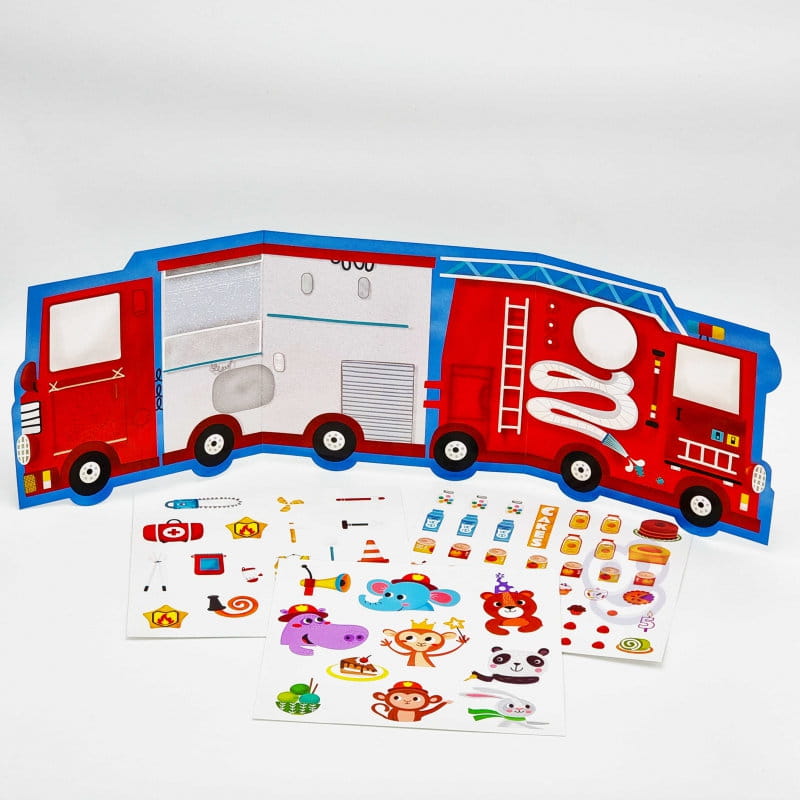Zestaw zawiera dwustronną plansze do wyklejenia oraz 76 naklejek. Jedna strona planszy to wóz strażacki, a druga to lodziarnia. Do wozu można dokleić takie elementy jak wyposażenie wozu np. gaśnica, apteczka czy małpka strażak, a na lodziarnie różnego rodzaju desery i nie tylko. Dziecko samo decyduję, gdzie umieścić dany element .