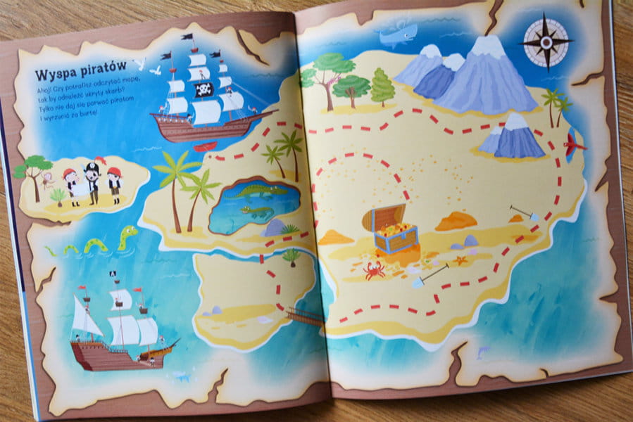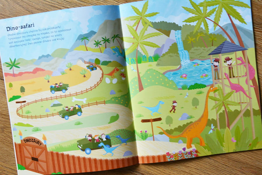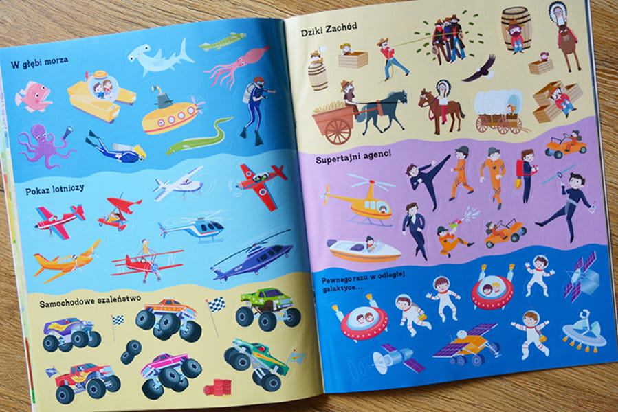 Książeczka z różnymi scenami lubianymi przez chłopców i mnóstwem naklejek do dowolnego wyklejania tematycznych stron przedstawiających dinozaury, turniej rycerski, grę w piłkę, wyścigi samochodowe, samoloty, dziki zachód, tajnych agentów, kosmos, roboty i stwory czy wyspę piratów.
