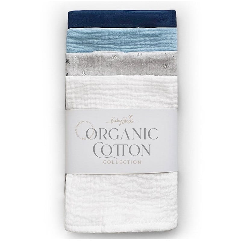 Zestawy czterech cudownej jakości muślinowych pieluszek z bawełny organicznej z certyfikatem GOTS. Zestaw Boy Set dla chłopców zawiera 4 pieluszki 30 x 30 cm marki Baby Steps.