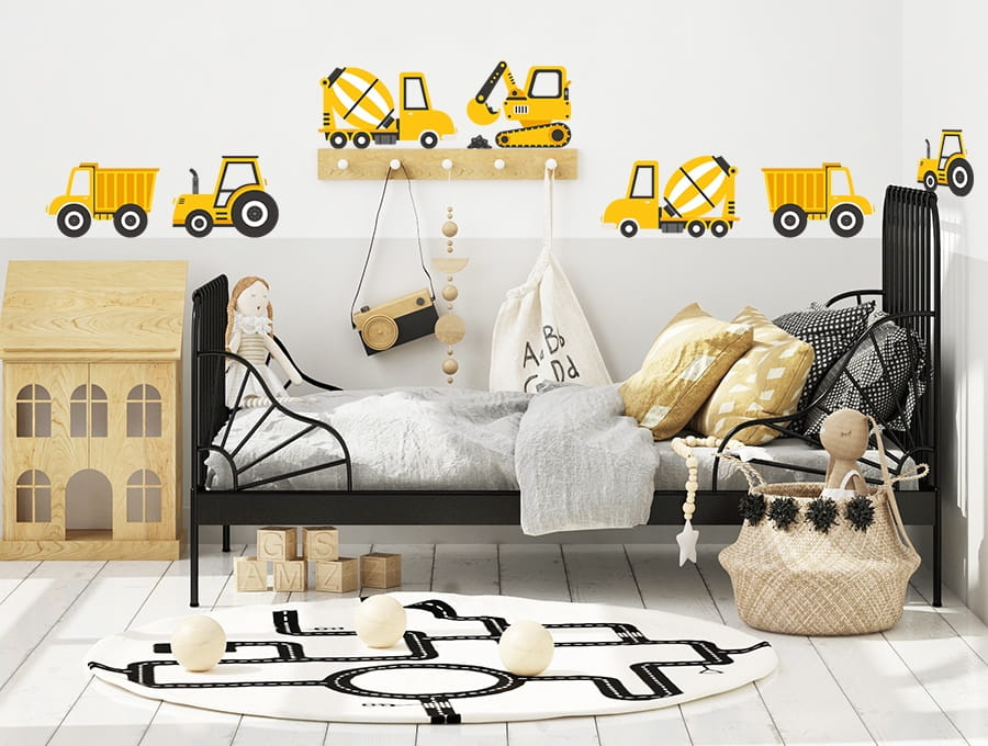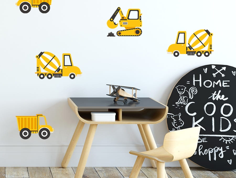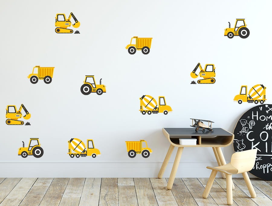 Zamień pokój dziecka w prawdziwy plac budowy, dzięki serii naklejek, w których skład wchodzą: koparki, betoniarki, traktory i wywrotki.
