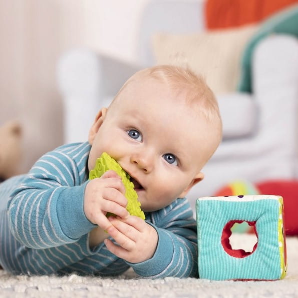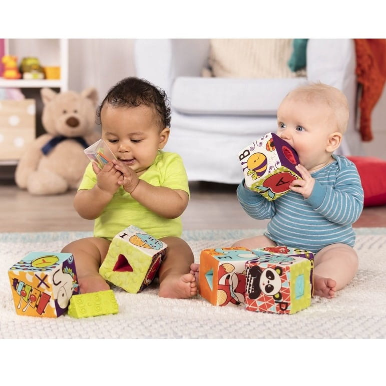 Klocki materiałowe z wypełnieniami w funkcji sorterów marki B.Toys.