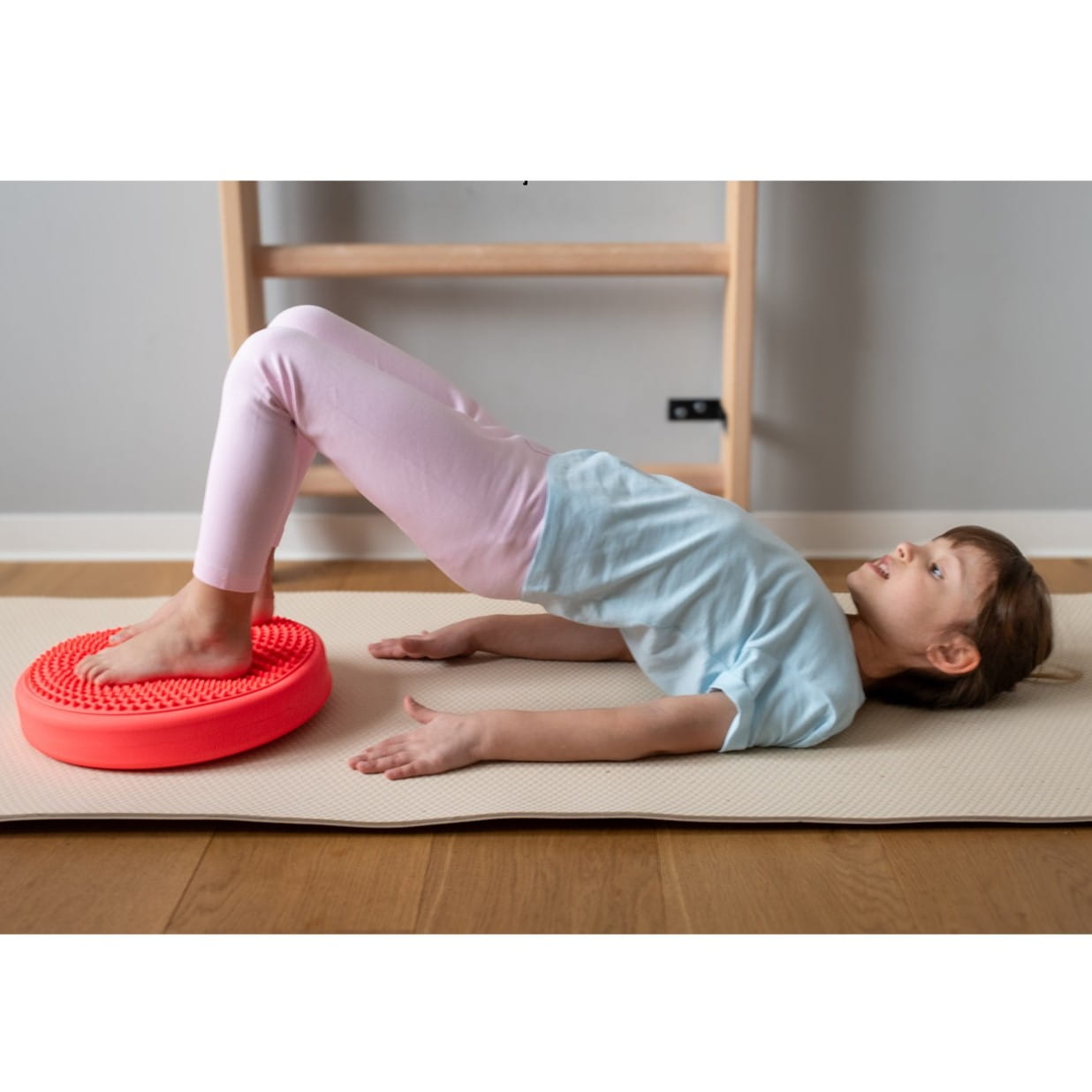• Aktywność podczas siedzenia: Delikatne kolce i niestabilna powierzchnia poduszki sprawiają, że dziecko musi stale balansować, co aktywizuje mięśnie stabilizujące i poprawia równowagę.