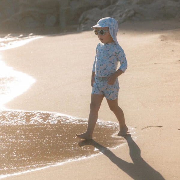 Czapeczka z osłoną karku ochroni malucha przed promieniami słonecznymi, niezależnie od tego, czy pluska się w wodzie, czy buduje zamki z piasku na plaży. Osłona karku chroni tył szyi, a daszek chroni oczy i twarz przed bezpośrednim działaniem promieni słonecznych. Czapeczka jest wykonana z szybkoschnącego materiału i jest idealna na długie godziny zabawy w wodzie. Dostępna w dwóch rozmiarach i jest doskonałym dodatkiem do pasującego kostiumu kąpielowego z długim rękawem.
