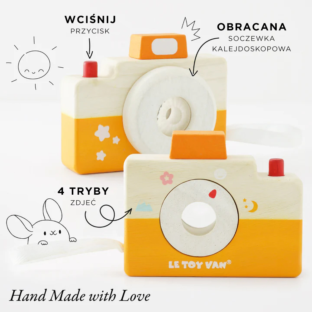 Ta wspaniała zabawka stymuluje zmysły, rozwija ciekawość oraz zręczność poprzez kreatywną zabawę i stanowi doskonały prezent dla małych fotografów. Wykonana z solidnego drewna kauczukowego pochodzącego ze zrównoważonych zasobów i pomalowana bezpiecznymi dla nawet najmłodszych dzieci farbami na bazie wody. Wszystkie zabawki marki Le Toy Van są projektowane w Wielkiej Brytanii przez doświadczony zespół utalentowanych projektantów i wytwarzane z poszanowaniem etyki oraz bieżących potrzeb naszej planety.