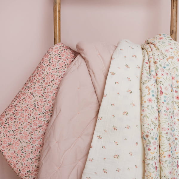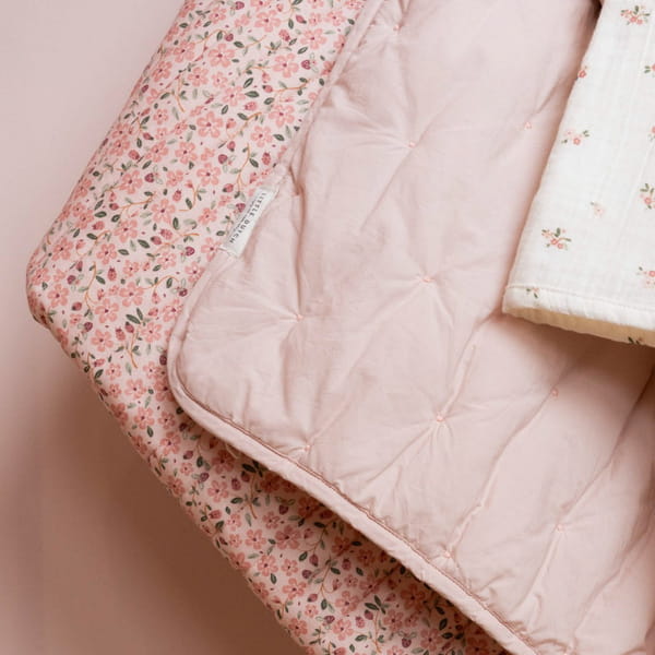 Kocyk 70x100 cm Blossom od Little Dutch. Miękki pikowany kocyk, który zapewnia dziecku cudowne ciepło i komfort. Dzięki miękkiej pikowanej bawełnie z jednej strony, z wyhaftowanymi kropkami, oraz przyjemnej tkaninie interlock z drugiej, może być używany jako kocyk do łóżeczka, narzuta lub mata do zabawy. Delikatny różowy kolor Blossom wnosi do pokoju dziecięcego przytulność i spokój, a także pięknie łączy się z innymi produktami z kolekcji Fairy Garden.