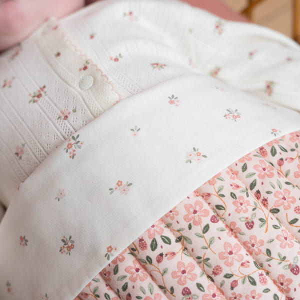 Kocyk 70x100 cm Fairy Floral & Fairy Blossom od Little Dutch. Piękny kocyk, który zapewni dziecku cudowne ciepło i przytulność podczas snu. Wykonany z bawełny organicznej i ozdobiony subtelnymi pikowanymi paskami w nowoczesnym stylu. Delikatnie wypełnienie dodaje mu miękkości. Kocyk jest dwustronny - można wybrać subtelny nadruk Fairy Blossom z jasną tkaniną usianą małymi kwiatami lub różową kwiatową stronę Fairy Floral. Idealny wybór do pokoju maluszka. Kocyk pięknie łączy się z innymi produktami z kolekcji Fairy Garden.