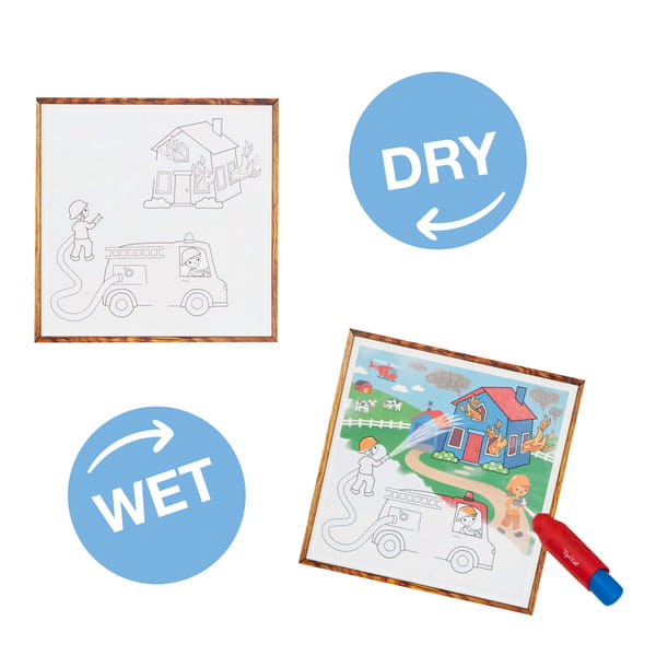 Maluchy mogą odkrywać malowanie bez bałaganu dzięki temu przenośnemu zestawowi. Kolorowanka wodna to idealne wprowadzenie do malowania dla maluchów. Ukryte obrazki można odkryć przy użyciu samej wody za pomocą grubego pędzla wodnego o idealnym rozmiarze dla małych rączek. Po wyschnięciu sceny znikają, dzięki czemu dzieci mogą bawić się w kółko! Do odkrycia są 4 obrazki z motywami samochodów, aut strażackich i traktorów. Z tyłu każdego obrazka są zadania - na każdej planszy z ilustracjami należy odszukać i policzyć podczas malowania określone elementy. Gwarantuje to wiele godzin zabawy!
