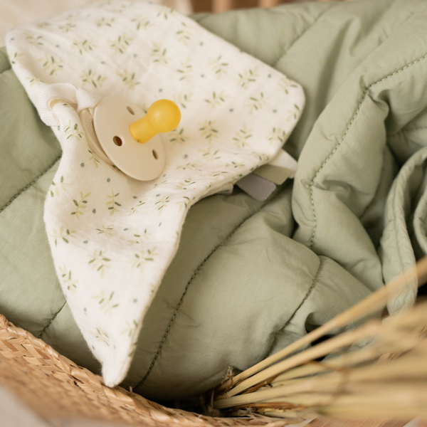 Kocyk 70x100 cm Blueberry Leaves Sage od Little Dutch. Miękki pikowany kocyk, który zapewnia dziecku cudowne ciepło i komfort. Dzięki miękkiej pikowanej bawełnie z jednej strony, z wyhaftowanym liściem borówki, oraz przyjemnej tkaninie interlock z drugiej, może być używany jako kocyk do łóżeczka, narzuta lub mata do zabawy. Szałwiowy kolor wnosi naturalną świeżość i spokój do pokoju dziecka i pięknie łączy się z innymi produktami z kolekcji Blueberry Leaves.