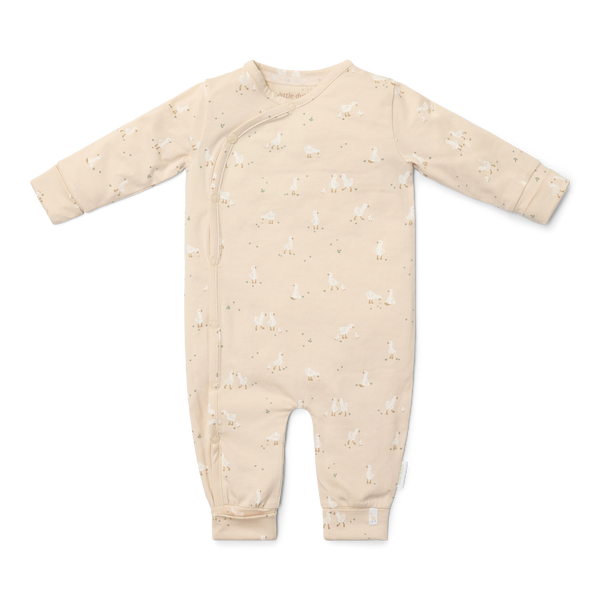 Piżamka jednoczęściowa Litle Goose - 62 cm od Little Dutch. Ta urocza piżamka w kolorze piaskowym z zabawnym nadrukiem Little Goose to ciepły i przytulny wybór dla Twojego maluszka. Kopertowy krój ułatwia ubieranie i rozbieranie, a odwijane mankiety na rękach i nogach sprawiają, że piżama rośnie razem z dzieckiem. Miękka, organiczna bawełna jest idealna dla wrażliwej skóry niemowląt.