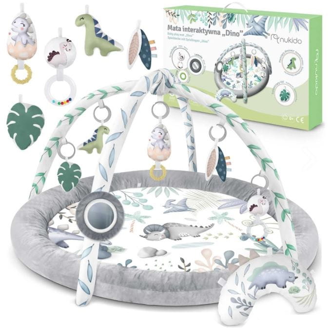 Mata ma pastelowe kolory. W zestawie znajduje się 5 zabawek do zawieszenia oraz lusterko i wałek - poduszka tummy time, na której można wesprzeć maluszka leżącego na brzuszku.