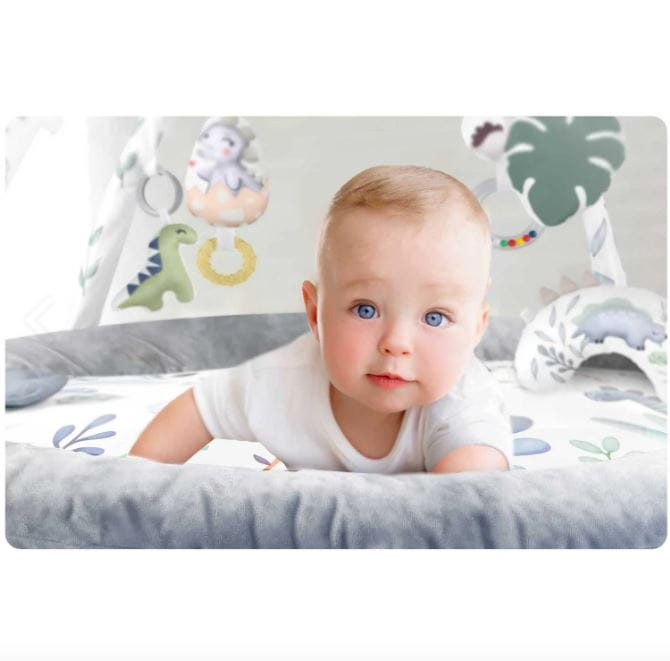 Zarówno obrzeże maty jak i poduszka tummy time mają wszyte tasiemki na które można zaczepić dodatkowe zabawki.