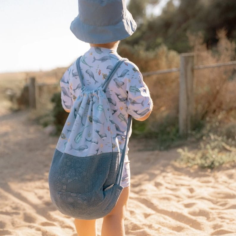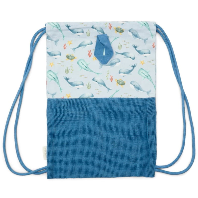 Praktyczny i trwały worek do przenoszenia strojów kąpielowych, czapek i butów, a także zabawek plażowych. Wykonany z 100% bawełny organicznej. Dolna część worka to tkanina siateczkowa, aby mokre rzeczy mogły szybciej wyschnąć lub piasek z zabawek mógł wypaść. Idealnie się przyda do spędzenia dnia na plaży lub basenie!