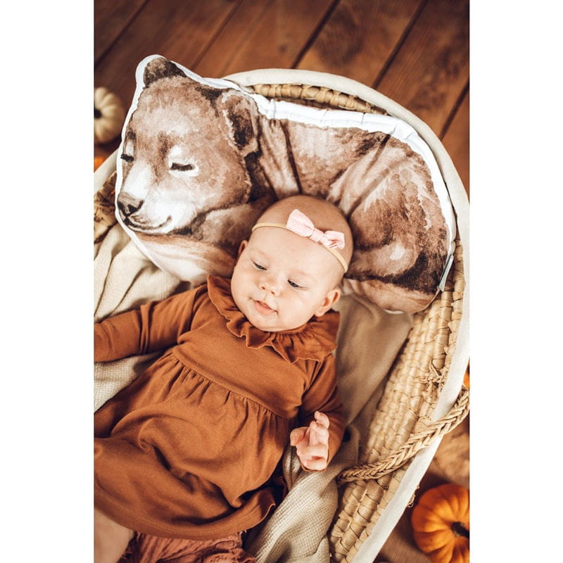 Słodka, urocza i jedyna w swoim rodzaju poduszeczka w kształcie zwierzątka - niedźwiadka. Poduszka może stać się pierwszą przytulanką, przyjacielem pierwszych podróży czy spacerów. Poduszeczka jest płaska, wykonana z najwyższej jakości materiałów bezpiecznych dla dziecka.
