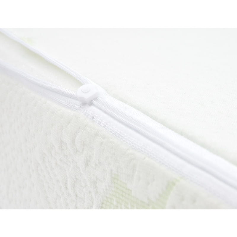 Trwały i delikatny w dotyku pokrowiec z tkaniny Aloe Vera ma właściwości antyalergiczne i antybakteryjne. Zastosowanie zapięcia na zamek błyskawiczny bardzo ułatwia zdejmowanie i konserwację pokrowca. Wkład został wykonany z wytrzymałej i elastycznej pianki o gęstości T25, która został poddana karbowaniu na całej powierzchni. Takie rozwiązanie zapewnia właściwą cyrkulację powietrza i nie dopuszcza do nadmiernego pocenia główki oraz szyi dziecka. Wysoka gęstość zastosowanej pianki gwarantuje brak trwałych odkształceń, nawet przy długotrwałym nacisku.