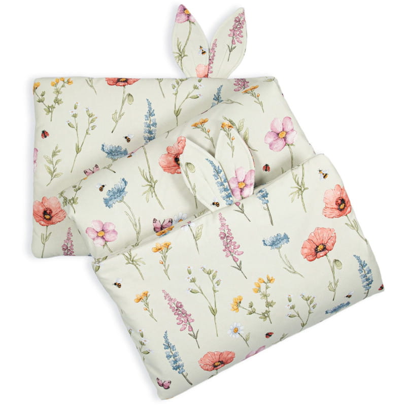 Zestaw zawiera ultra lekką i miękką kołderkę z wypełnieniem oraz płaską, bezpieczną dla niemowlęcia poduszkę.