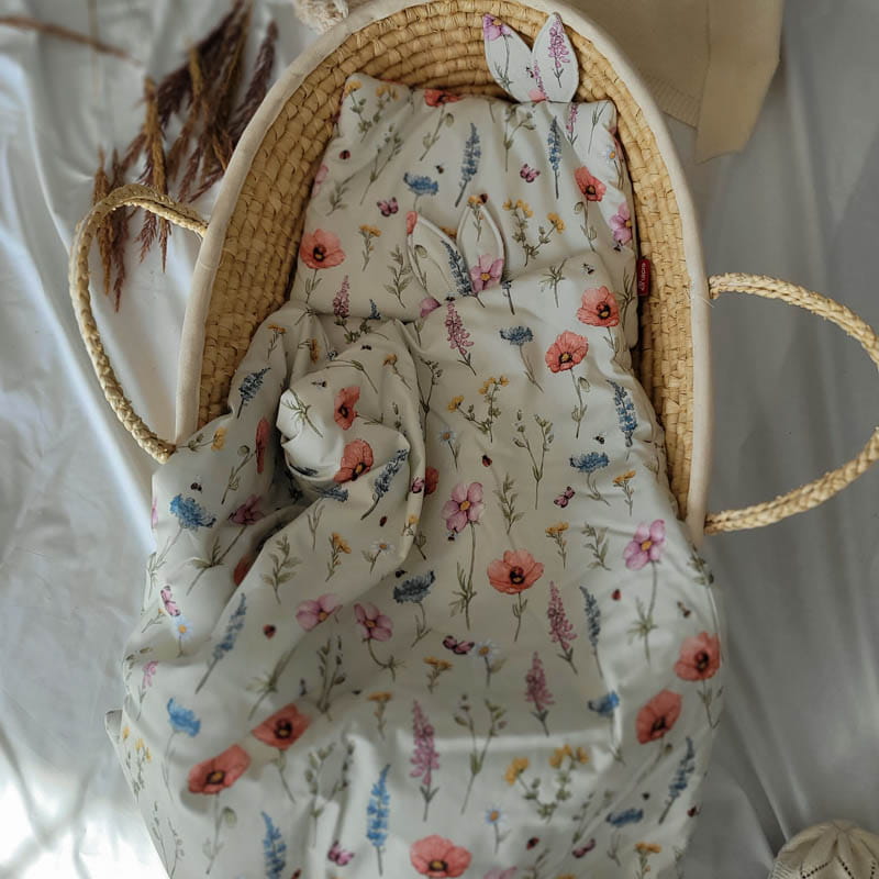 Zestaw zawiera ultra lekką i miękką kołderkę z wypełnieniem oraz płaską, bezpieczną dla niemowlęcia poduszkę.