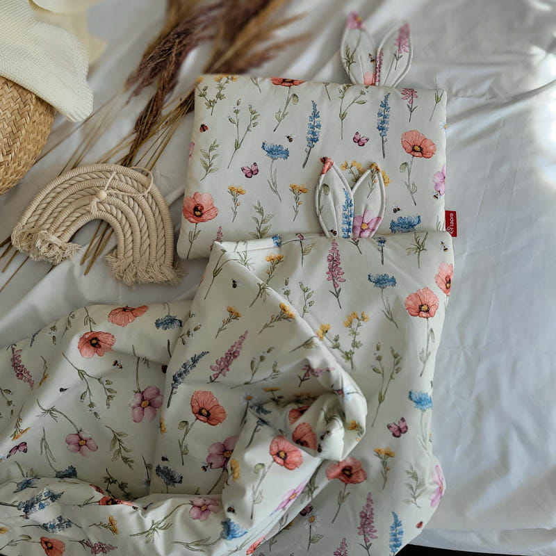 Piękny, ozdobny i niezwykle praktyczny komplet pościeli z wypełnieniem, na który składa się mięciutka i niezwykle lekka kołderka z ozdobnymi uszkami oraz płaska podusia także z uszkami, bezpieczna dla niemowlęcia.