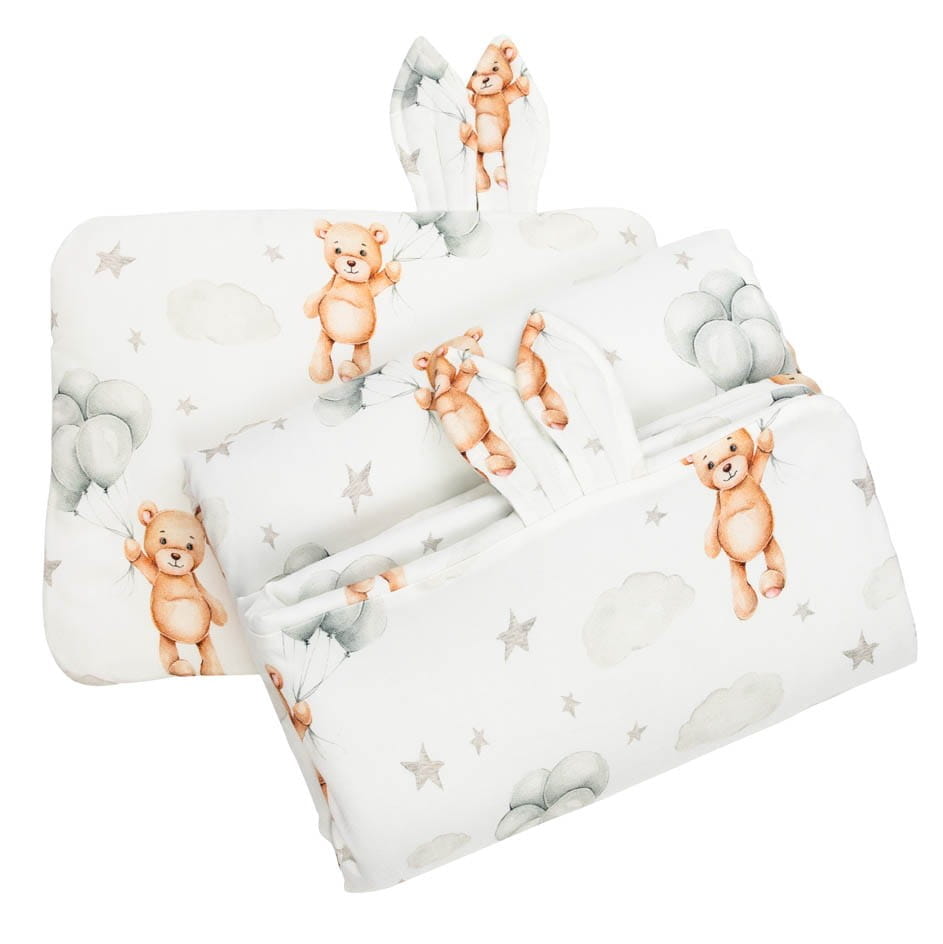 Komplet bawełnianej pościeli z wypełnieniem i uroczymi uszkami Misie z Balonami polskiej marki Lepre.