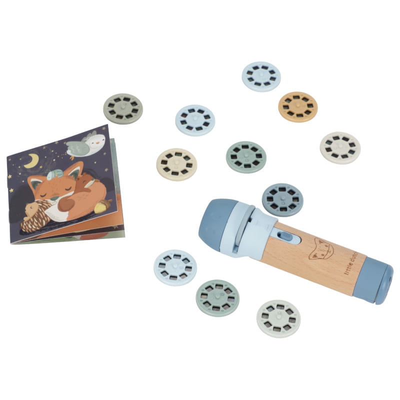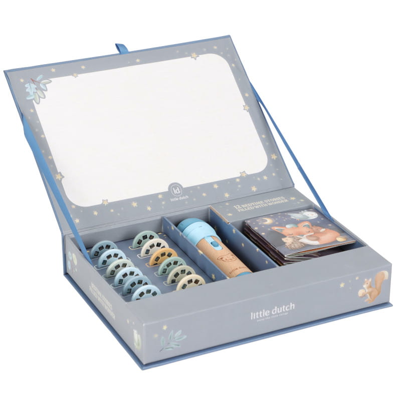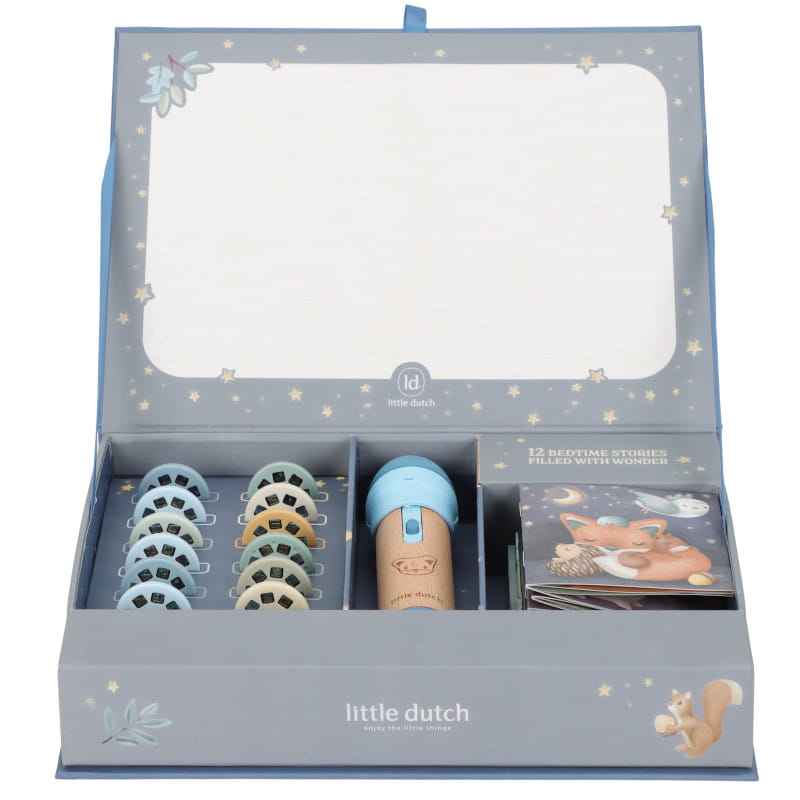 Latarka projektor Błękit od Little Dutch to praktyczny zestaw do wyświetlania pięknych ilustracji w pokoju dziecka – na pudełku, ścianie lub suficie. W komplecie znajduje się 12 dysków z bajkowymi ilustracjami, a każda historia jest dodatkowo opatrzona pasującą mini książeczką z obrazkami, dzięki czemu dziecko może śledzić opowieść i rozwijać swoją wyobraźnię. Latarka projektor została zaprojektowana przez markę Little Dutch z myślą o najmłodszych – jest bezpieczna, trwała i łatwa w obsłudze.