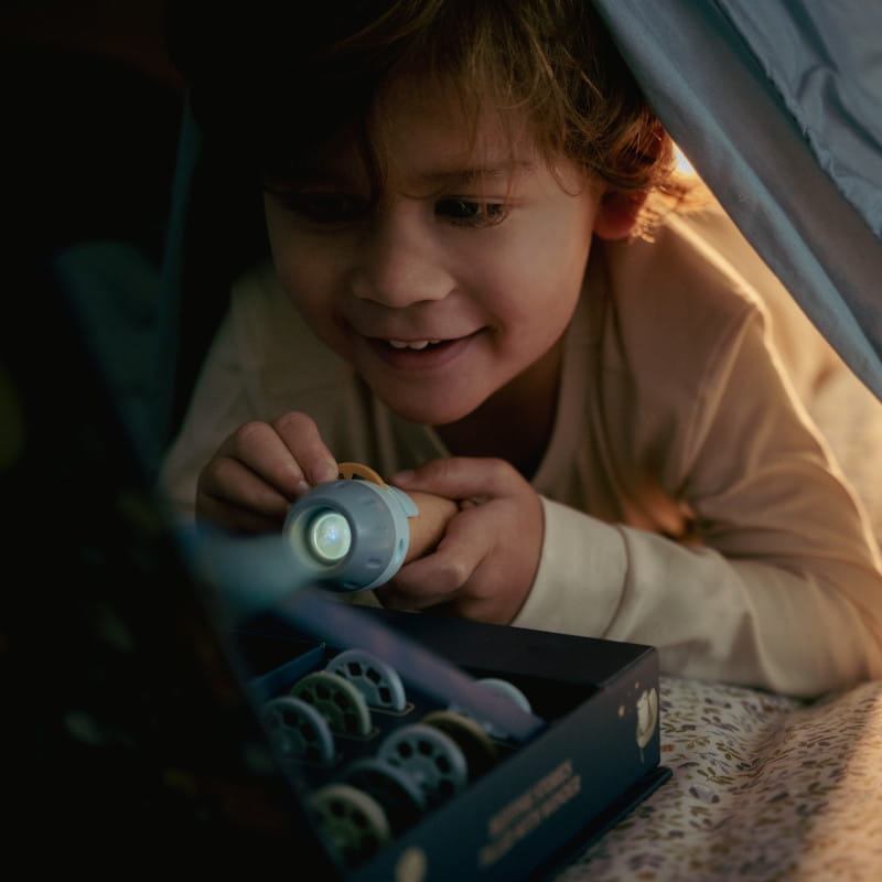 Solidny drewniany uchwyt sprawia, że projektor pewnie leży w dłoniach dziecka, a lekka konstrukcja umożliwia zabawę w dowolnym miejscu. Zasilanie bateriami daje pełną swobodę, bez ograniczeń wynikających z obecności gniazdka elektrycznego. Każdy element latarki został zaprojektowany z maksymalnym naciskiem na bezpieczeństwo użytkowania. Projektor nie posiada ostrych krawędzi ani małych części, które mogłyby stanowić zagrożenie dla najmłodszych. Wszystkie materiały użyte do produkcji są wolne od BPA i innych szkodliwych substancji, co czyni zabawkę odpowiednią już dla dzieci o 3 roku życia!